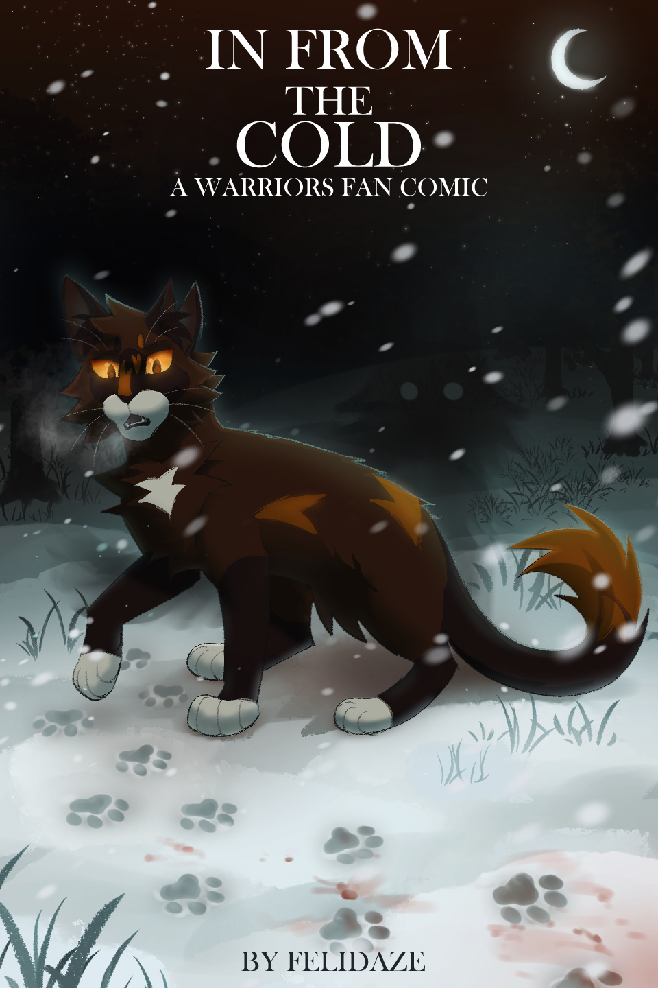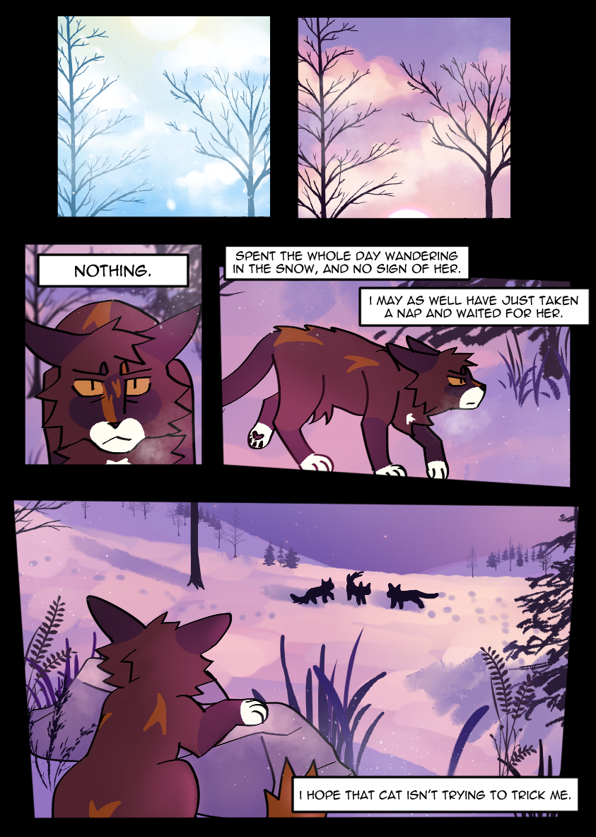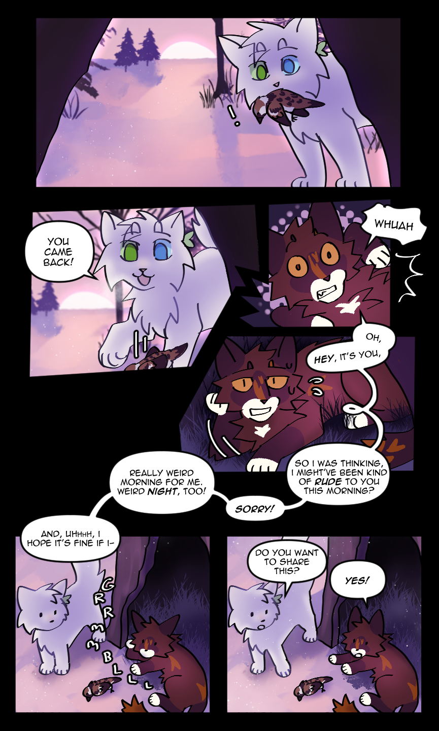 Right now, I'm working on my webcomic which is titled IN FROM THE COLD! it's specifically a Warrior Cats fan comic, featuring my characters that I've been developing for about 2 years. It primarily follows a cat named Smolderpaw, and her experience adjusting from an isolated life as a loner to suddenly being a part of a large clan environment full of other cats. it's very early on in the story right now but I promise a lot of very juicy character drama and cool art in its future chapters. Maybe check it out and support my cat drawing endeavors if you're so inclined, I'm really enjoying working on it so far."